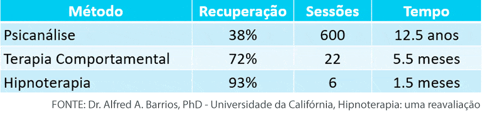 Uma pesquisa feita pelo Dr. Alfred A. Barrios, PhD em psicologia clínica pela Universidade da Califórnia, concluiu que os resultados da hipnoterapia são mais eficazes na resolução de problemas emocionais, quando comparados a outros tratamentos.